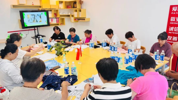在实践环节,志愿服务队引导家政人员将旧T恤改造为实用手拎袋,生动践行“变废为宝”的环保理念。