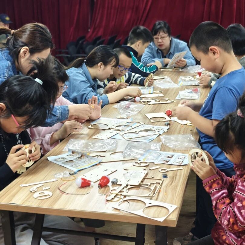 “齿轮要和转轴对齐才能转起来!”“灯亮了!我的发电机真的能发电!”在“手作动能实验室”里,孩子们化身“小小工程师”,在家长和老师指导下组装手摇发电机。从拼接齿轮、线圈到见证灯珠亮起,亲子携手攻克难关,在实操中直观掌握“机械传动”与“电磁感应”原理,既体验动手乐趣,更增进情感交融。