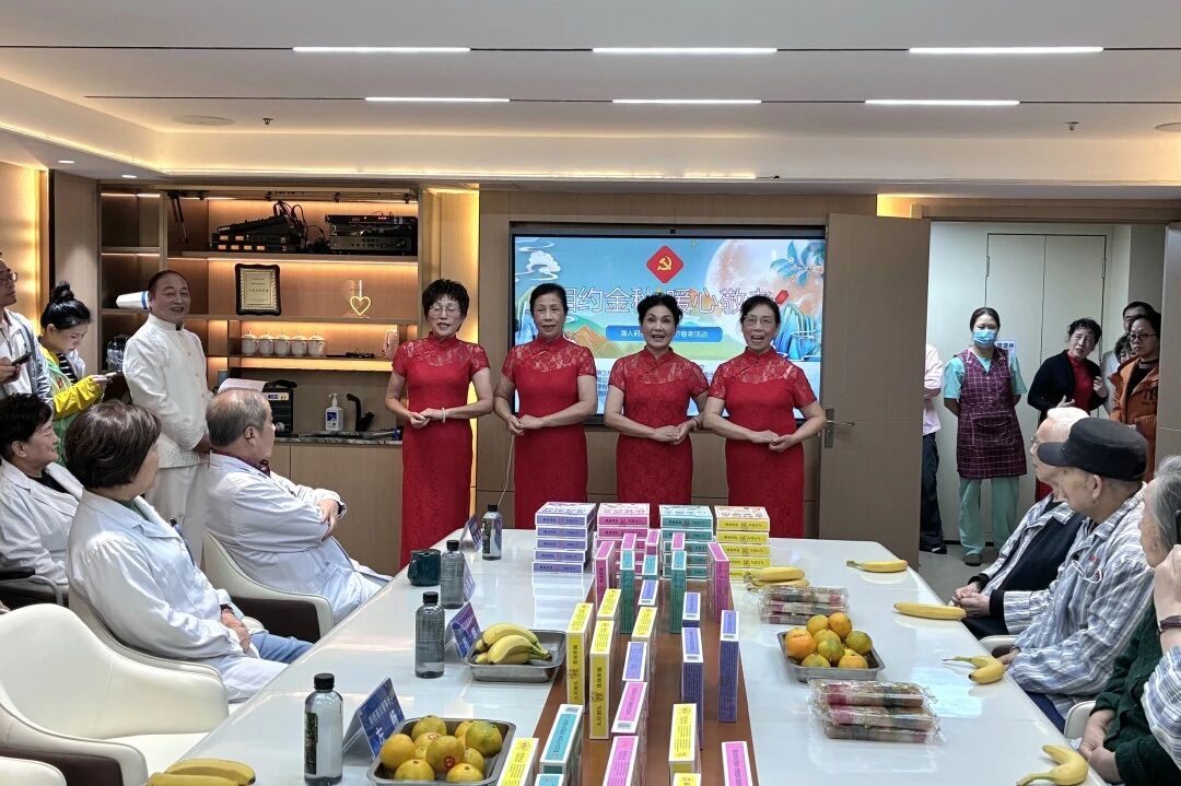 作为基层治理的前哨与枢纽,街区前期深入摸排,收集护理院老人在节日慰问、金融安全守护、精神文化滋养等方面的需求。针对需求,街区迅速调度资源联系走访的中州期货、德邦基金等企业在重阳来临之际送来重阳糕等慰问品,传递节日祝福;德邦基金发挥专业优势,面向高风险老年群体开展“养老防非反诈”宣传;红色沪剧班则带来精彩文体表演,丰富老人精神生活。